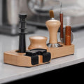 Espresso tamp station in solid wood keeps your tamper, portafilter, and tools organized. A premium barista accessory for clean counters and perfect shots.