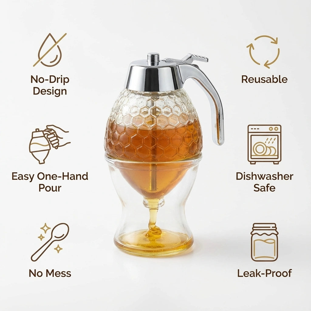 A clean, drip-free honey dispenser that lets you pour honey or syrup smoothly with one press — no sticky hands, no messy countertops.• One-press lever for smooth, controlled flow.
