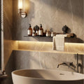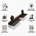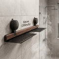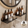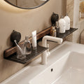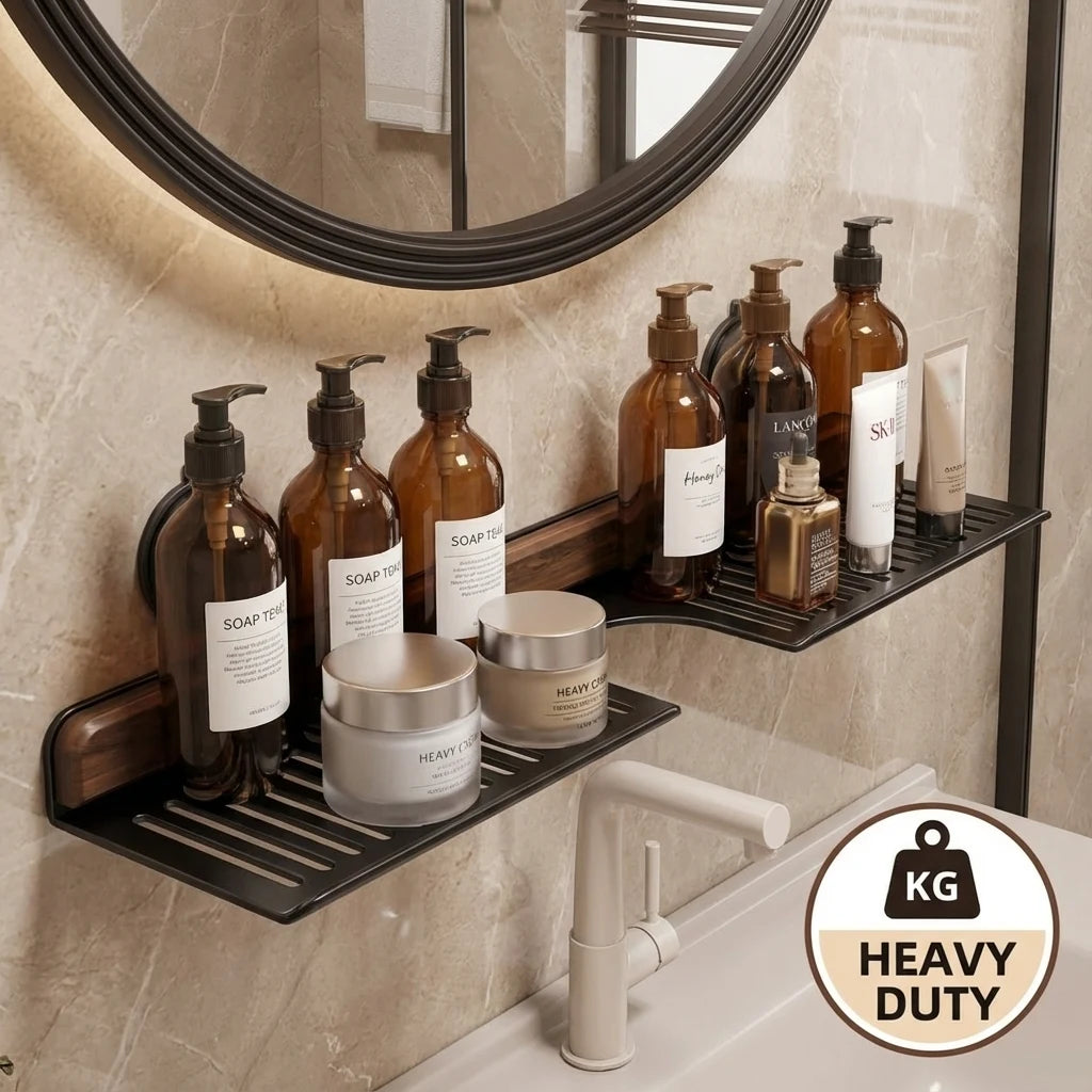 A clean, no-drill walnut shelf that creates instant storage and organization above any bathroom or kitchen sink.